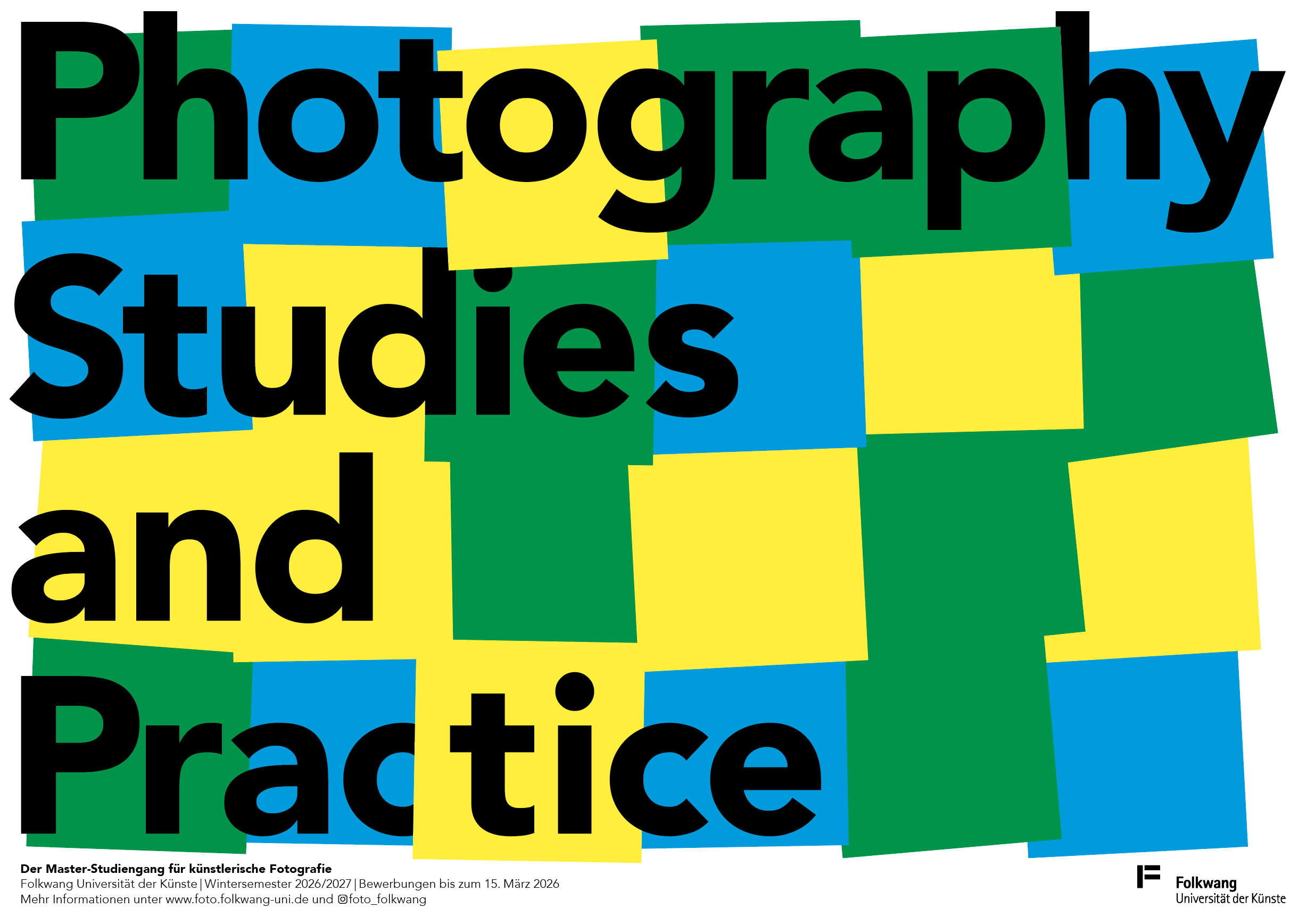 Die durch sechs verschiedene Professuren vertretenen Lehrgebiete bieten vielfältige Möglichkeiten, die eigene fotografische Praxis individuell zu vertiefen und durch neue Arbeitsweisen zu erweitern. Im Lauf von vier Semestern sollen eigene Projekte entwickelt und in Form von Ausstellungen, Büchern und online erprobt werden. Stets zu Beginn des dritten Semesters haben alle Studierenden der beiden Master-Programme »Photography Studies« die Möglichkeit, im Museum Folkwang mit der eigenen Ausstellung »Stopover« den Dialog mit der Öffentlichkeit aktiv zu suchen. Darüber hinaus bietet die Galerie 52 fortlaufend die Möglichkeit, eigene Projekte in Form einer Ausstellung zu verwirklichen. Gemeinsame Kolloquien, Projektkurse und Exkursionen sind wichtige Gelegenheiten für einen sich zwischen Praxis und Theorie entfaltenden Dialog.